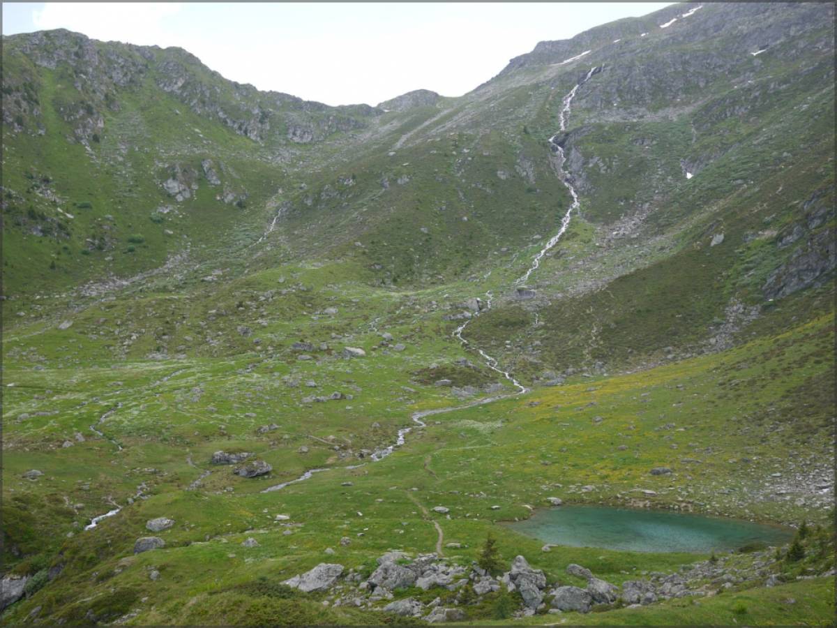 Au croisement du point 2087, on poursuivra sur notre sentier pour passer près d'un petit lac aux reflets émeraude avant de débuter notre retour en plaine au point 2074 (à noter que l'on pourrait poursuivre en direction de la cabane Brunet, mais par la suite, les possibilités de retour sur Bruson sont limitées...).
