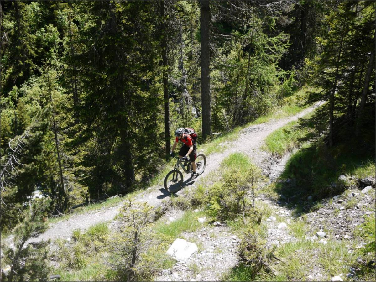 A la bifurcation qui suit le point 1758 on traverse le torrent de l'A pour rejoindre le bisse qui part sur l'autre versant. Comme tous les bisses, c'est un véritable régal que de rouler dessus...et comme tous les bisses il peut être fréquenté par des promeneurs, alors soyez prudents et courtois ! On poursuivra cette traverse jusqu'au Chapelet, puis jusqu'au point 1642 (cette partie n'est pas sur les cartes...) où on retrouvera notre dernière piste de la journée afin de monter jusqu'à l'Alpage de Bavon.