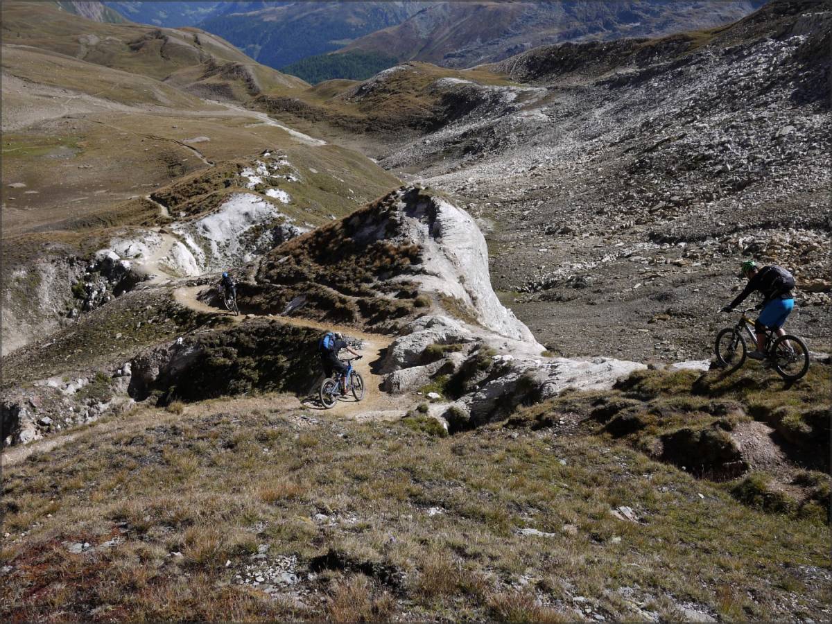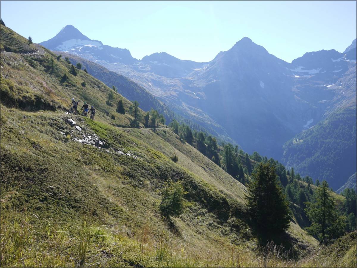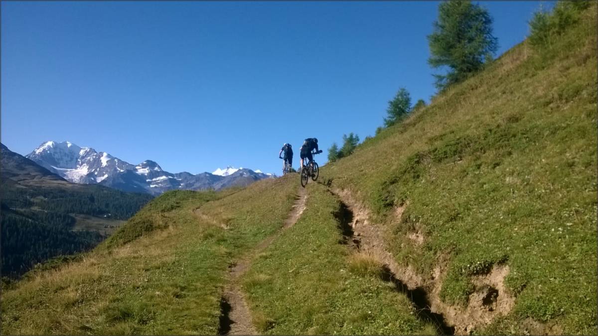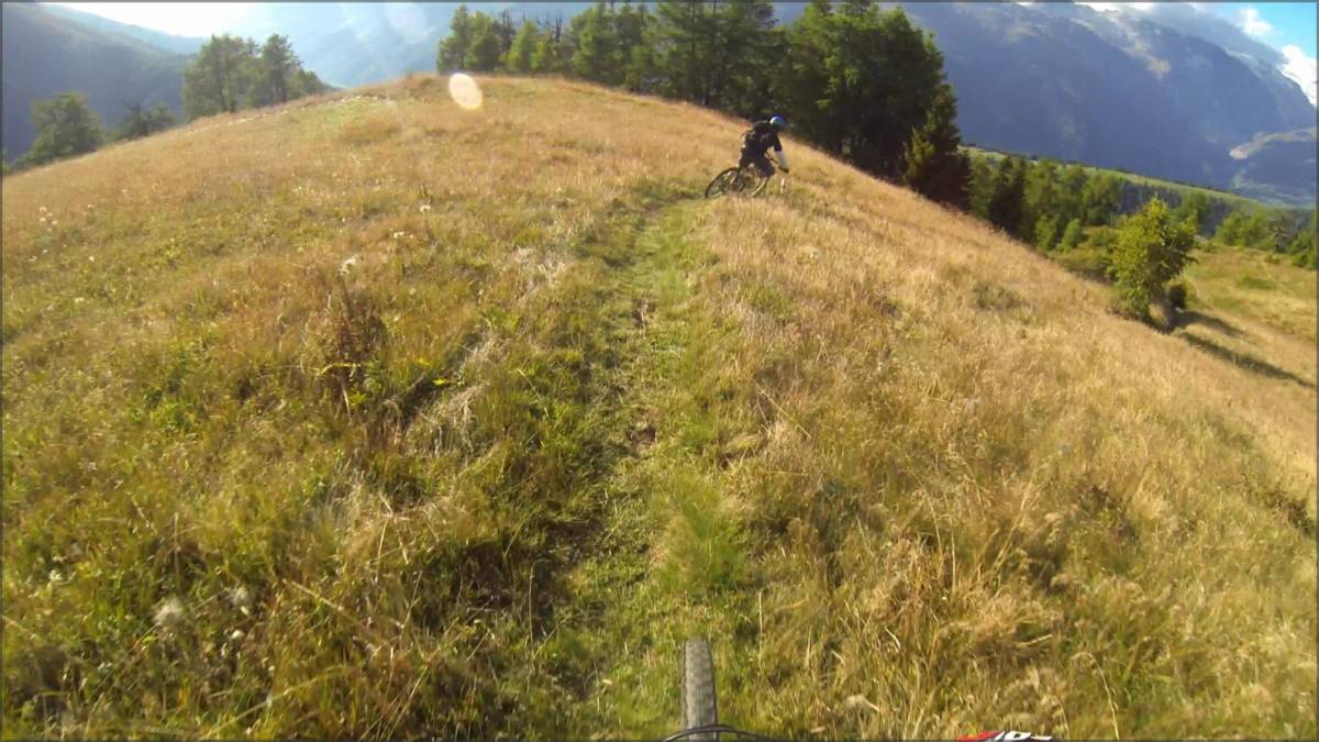 De Bärg, on emprunte le sentier qui traverse à flanc de coteaux (bien roulant, mais parsemé de quelques petits coups de cul) et qui permet de récupérer une piste qui elle-même nous amène au sentier joueur qui descend sur Binnega, Wasen puis Z'Brigg.