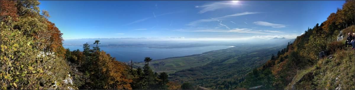 Une fois arrivé au point 765 de la descente, au lieu de continuer à descendre, on va remonter la petite route jusqu’à Villars-Burquin afin de suivre la route principale qui monte à Mauborget. Bien faire attention à la circulation, heureusement on ne passe qu’une petite dizaine de minutes sur cette route, le temps de faire une épingle et d'atteindre le chemin 4x4 qui part direction est juste après le réservoir en bord de route. De là c’est une longue traverse en faux plat qui nous permet de rejoindre une petite route (itinéraire pédestre…) que l’on va remonter sur quelques épingles. En faite il suffit de suivre les indications du tourisme pédestre, la route va ensuite se transformer en un chemin 4x4 qu’on suit jusqu’au point 1134 et encore environ 500m de plus. De là c’est droit dans la pente ou presque, les cuisses chauffent bien mais c’est les derniers efforts avant d’arriver au lieu dit « Sur la Roche » et d’admirer, si le temps le permet, la magnifique vue. Les tables et bancs présents, en plus du panorama, en font un endroit idéal pour une pause casse-croûte.