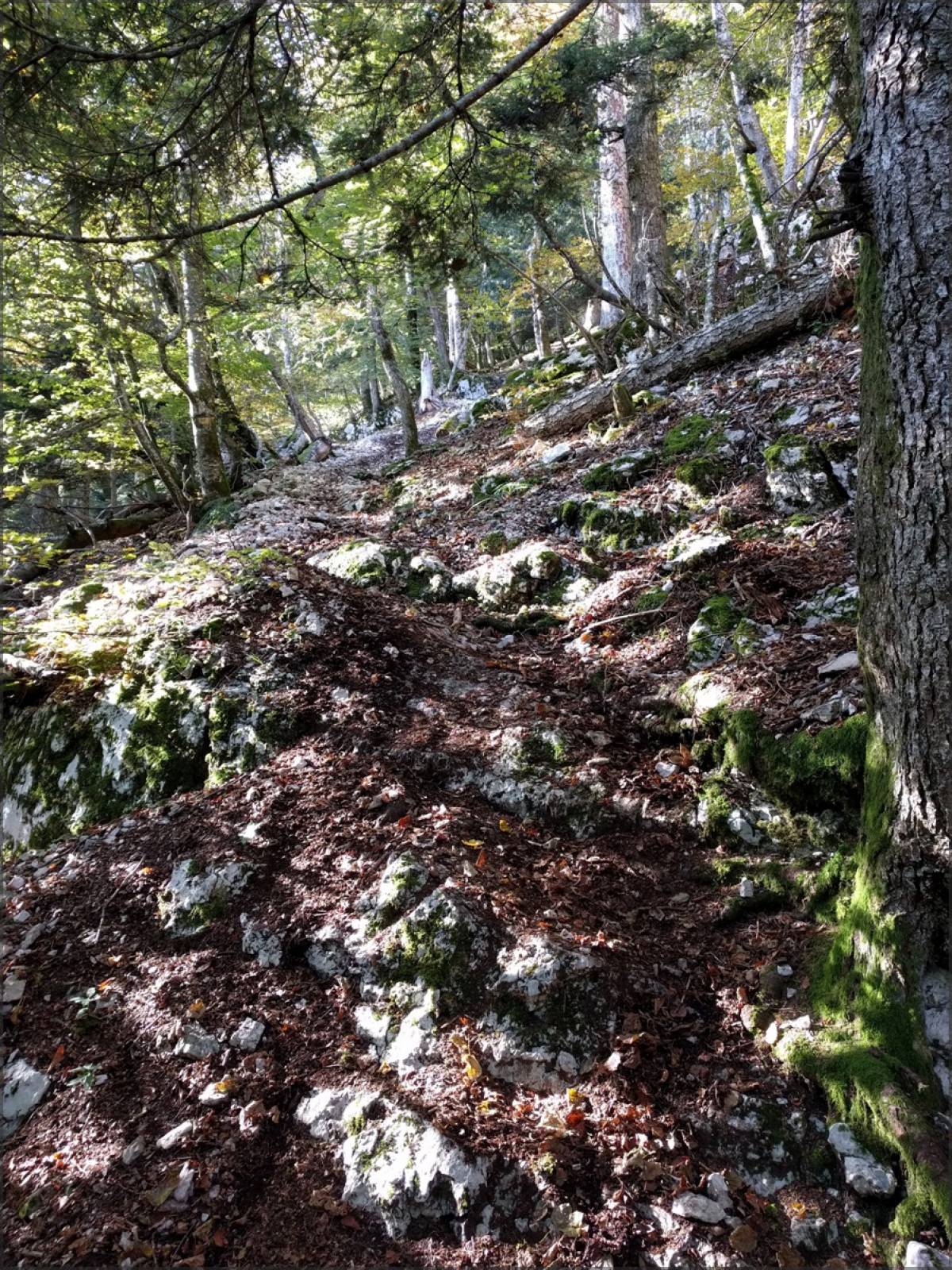 Bref, tout ça commence tranquillement, histoire de se chauffer, par une partie assez rapide et joueuse. Ensuite la difficulté va aller crescendo jusqu’à ce que le single croise le deuxième chemin 4x4 depuis le point point 1128. Là, ça se corse sérieusement. Rien d’impossible, mais disons que si vous avez rencontré des difficultés techniques précédemment sur le parcours, ça s’annonce plutôt compliqué et le mieux est peut-être de faire l’impasse sur cette partie en la contournant parle chemin 4x4 passant par le point 850. Notez que par temps humide ça doit pas être triste…